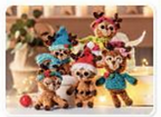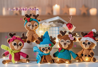 Five reindeer. The first has a pink headband, chartreuse scarf, and pink sweater body. The second has closed eyes and a blue with holly headband. The third has a blue scarf and hat. The fourth has a turquoise blue sweater body, closed eyes, and a pink bow. The fifth has a red santa hat and a belt.