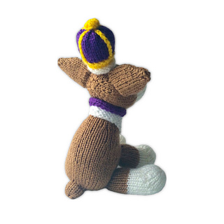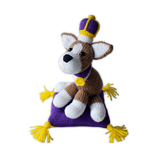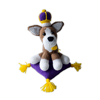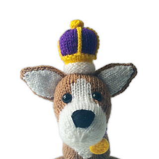 Monty is a royal Corgi, with a knitted crown and tasselled cushion … a regal delight! Designed by Amanda Berry @fluffandfuzz, these are knitted in acrylic DK yarns on single pointed needles (not in the round). The corgi uses intarsia colour-work to make the head, and the cushion is decorated with yarn tassels. The arches in the crown are single crochet chains, and the pattern also incorporates some short row shaping.