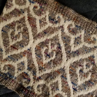 Work this elegant design in the round, with two options. Option A is for the cowl as shown. Yardage estimations are given for various circumferences, assuming the stated gauge. The circumference is easily adjustable, and an optional bonus chart is included for using thinner yarns (tighter gauges). Please note that the stranded motifs are worked only from charts.