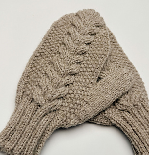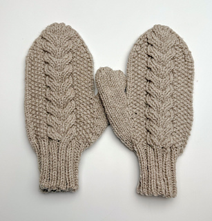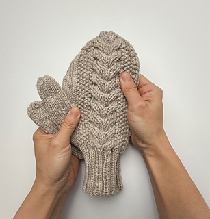The gloves are worked in the round from the bottom up. The right and left gloves are identical, except that the cable section is a mirror image: the palm side is worked in stockinette stitch, while the back of the hand features the cable pattern