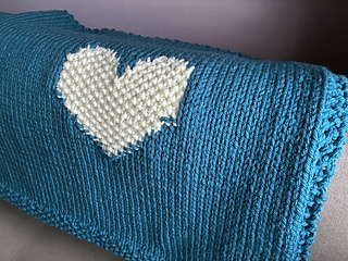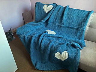 This blanket uses a super chunky yarn; the borders and heart motifs are worked in moss/seed stitch and the main body is knitted in stocking stitch. Three hearts are worked in moss/seed stitch using the intarsia method and are placed diagonally across the blanket. More hearts could be added if you wish.