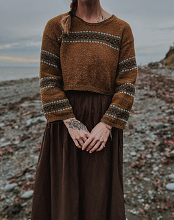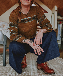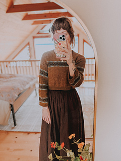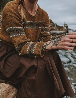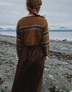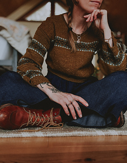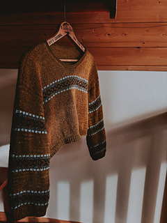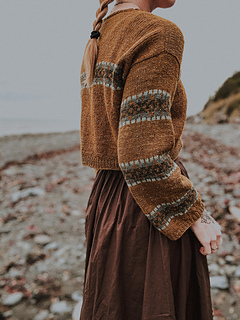 The pattern is knit from the top down, starting with the back knit flat to the armhole split. Then, the front shoulders are picked up from the back cast on edge and worked flat through the neck shaping before being joined. The remainder of the front is worked flat to the armhole split. The stranded colorwork is worked flat to this point. You then join the fronts and back to work the remainder of the body in the round. The sleeves are picked up and worked in the round. Finally, the collar stitches are picked up and a folded collar is made.