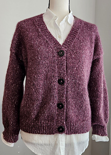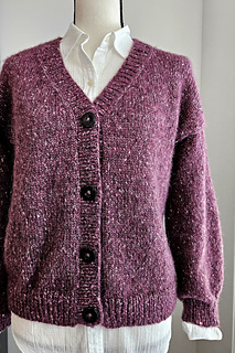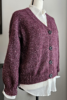 Mulberry Cardigan is knit seamlessly from top to bottom, making it easy to try on as you go. Knitting begins at the back with gently sloped shoulders created with short rows before working to the underarms where stitches are put on a holder. Stitches are then picked up for front shoulders, which are again shaped with short rows, to the underarms where front panels and back are joined and worked down to the lower hem. Sleeves are then picked up directly from the body and worked in rounds down to the cuffs. Button band and buttons are added last.