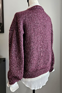 Let the tweed flecks in this slightly fuzzy heathered yarn do all the talking for this rather minimalist sweater. Simple stockinette stitch fabric really allows interesting yarns to shine. Consider selecting a yarn with similar characteristics.