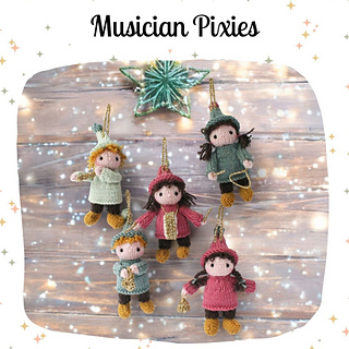 Knitting Pattern to make 5 musicians with instruments. They share the same basic body pattern.