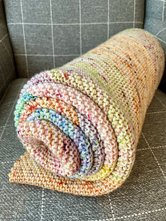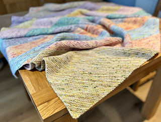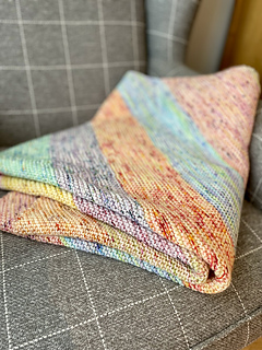 The blanket is knitted using fingering weight yarn, held double. It is worked in a corner to corner construction, and has some feature eyelets within the centre section.
