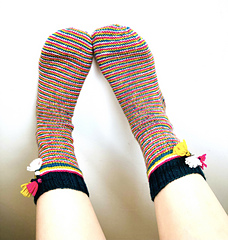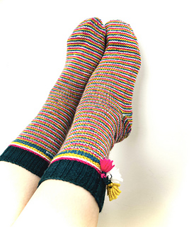 Starting with a solid Christmassy dark green, they quickly turn into a festive four colour braid, each with their own tassel decoration before swirling down the foot in an addictive sequence of four contrasting colours and ending with a right and left shaped toe.