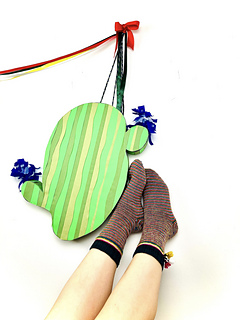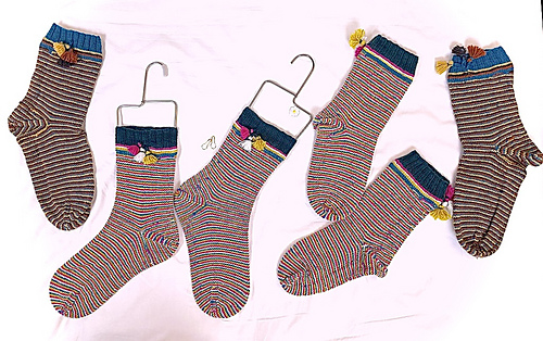 On commence avec un vert foncé festif, puis le motif se transforme rapidement en une tresse colorée et joyeuse à quatre teintes, chacune ornée d’un petit pompon décoratif, avant de descendre en spirale sur le pied dans une séquence addictive de quatre couleurs contrastantes, pour se terminer par une pointe différenciée entre la chaussette droite et la chaussette gauche.