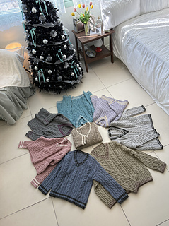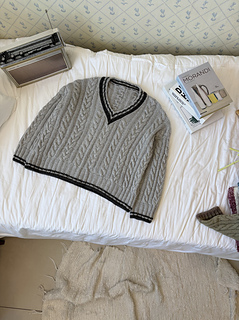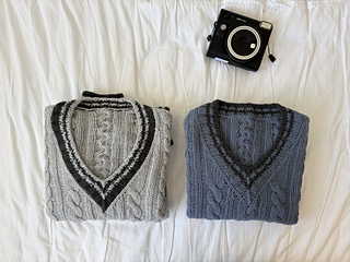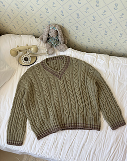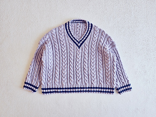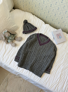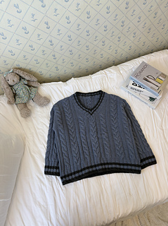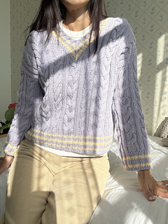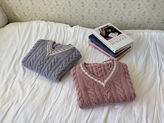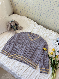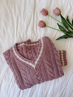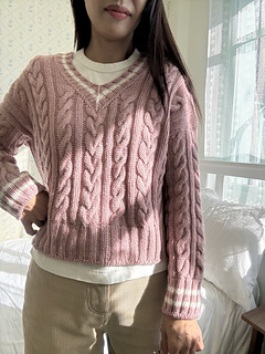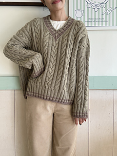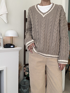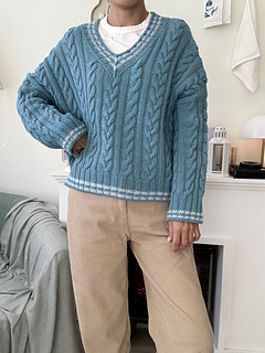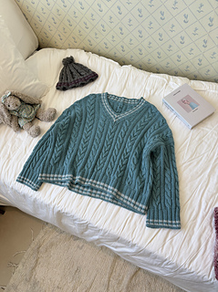 Mystar V-neck Sweater is a top-down cabled drop-shoulder pullover designed to be worn with approximately 20–30 cm (8–12 inches) of positive ease for a relaxed, oversized fit.
