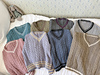 The sweater features a deep V-neckline and classic cable patterns, creating a naturally lifted front when worn. The cropped length option highlights this design particularly well, offering a modern and stylish silhouette. Two length options—cropped and standard—are included to suit different styling preferences.