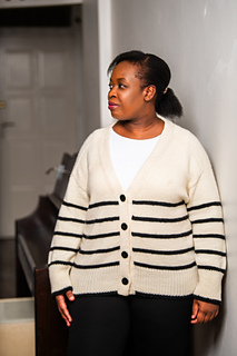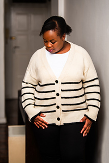 Namhla is your everyday cardigan that’s relaxed, cozy and modern. The cardigan has wide stripes that are fun and engaging to knit. Namhla features a saddle shoulder construction, wide ribbing and a V-neck construction.