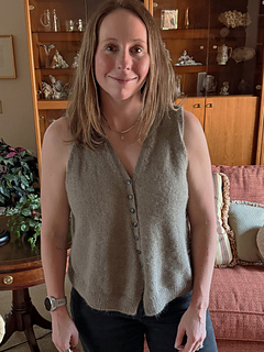This stockinette-stitch vest has fine ribbing details and pretty cable decreases. A slightly slanted buttonband creates a subtle A-line shape, for a very flattering fit that dips a little in the front and flares a little in the back.