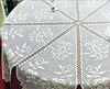 Table cloth with 8 filet wedges that have scrolls and roses.