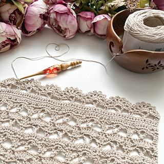 Romantic and airy. This design features elegant scalloped edges and open lace rows that create a timeless texture.