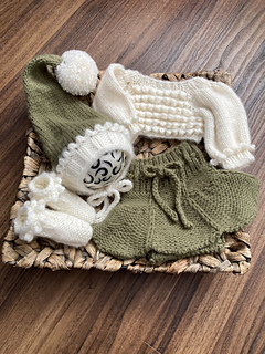 This is a downloadable PDF pattern for the knitting of this Natalia 4 piece crop sweater set in newborn/20-21 inch reborn size and NOT the actual finished items. Set includes knit puffer style crop sweater, skirted bottoms, long tail bonnet with oversized pompom and socks