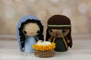 -Joseph: For the skin I used Lion Brand Vanna’s Choice in the color “Beige”. For the beard, mustache, and coat, I used Red Heart Super Saver in the colors “Café Latte” and “Warm Brown” (this is a discontinued color. Here is a good alternative: “Wheat”). For the headdress, I used Red Heart Soft in “Chocolate”. For the body and headdress band, I used Hobby Lobby’s I Love This Yarn in the colors “Dark Olive” and “Mid Green”.