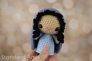 -Mary: For the skin, I used Lion Brand Vanna’s Choice in the color “Beige”. For the hair, headdress, and body I used Hobby Lobby’s I Love This Yarn in the colors “Black”, “Arctic Ice”, and “Soft Blue”.