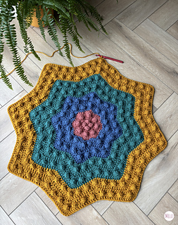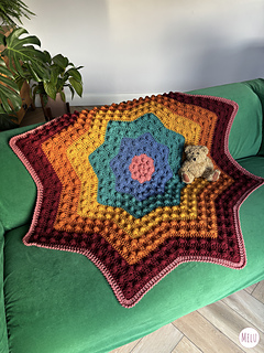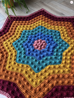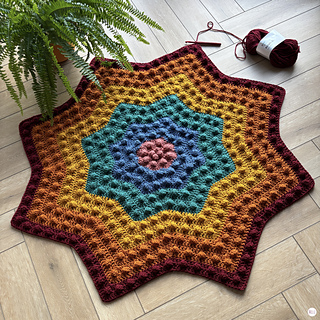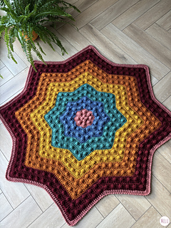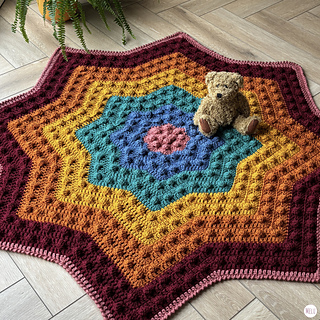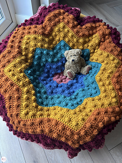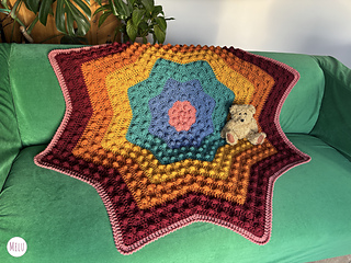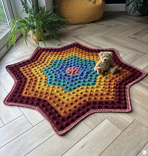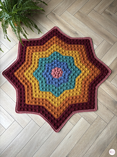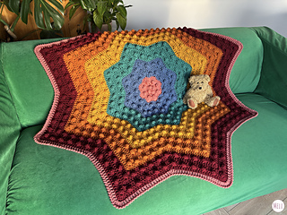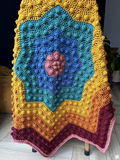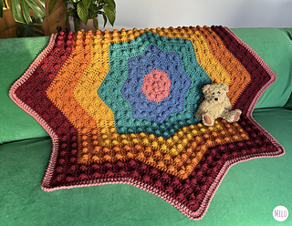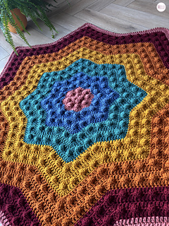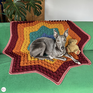 The Nebula Bobble Star Dark Rainbow Blanket is a striking, star shaped crochet blanket featuring a beautifully textured bobble pattern that radiates outwards like a glowing nebula.
