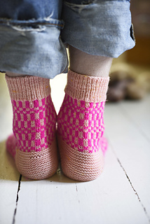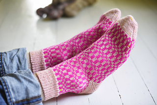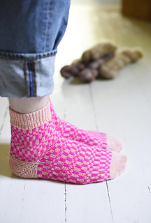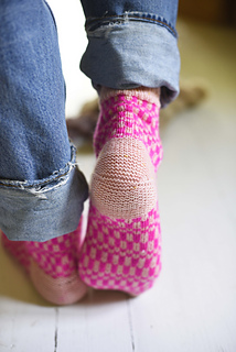 These socks are worked in two shades, a bright neon and a neutral pink in my case, making this pair an ideal project for playing with colour combinations.