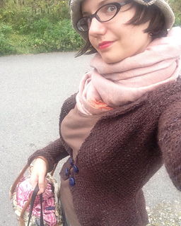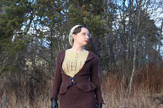 Materials: 1lb 5oz navy boucle wool,1 pr. No. 8 needles, 2 large buttons, 2 small buttons, Petersham to fit the waist, 1/8th yard 1/2 inch Petersham ribbon.