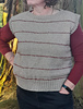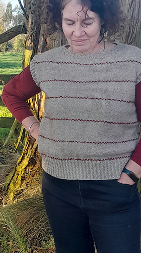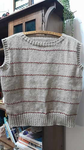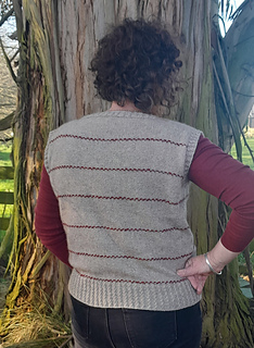 The vest is cast-on along the back neck and shoulders and short rows are worked to shape first once shoulder and then the other. The back yoke is then worked down with armhole shaping (the smaller sizes have decreases, the bigger sizes have increases) before the back is placed on hold. The right front is picked up along the back right shoulder and shaping is also worked on the shoulder. Increases shape the side of the neck opening, then this is also placed on hold while the left front is worked. Once both fronts are complete, the rest of the neck opening is cast-on and the front yoke is worked down with shaping the same as the back yoke. On both the front and back yokes a stripe of colour B is worked every 3” / 7.5 cm, this is maintained also throughout the body too. Once the front and back yokes are complete, stitches are cast-on under the arm and the front and back is joined and the body is worked down in the round. Once the body is complete a mock cable hem is worked. The neck opening and armholes are also completed with the mock cable rib.