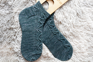 7 (7.5, 8, 8.5, 9, 9.5, 10, 10.5)” / 18 (19, 20.5, 21.5, 23, 24, 25.5, 26.5) cm circumference — select a size from the finished measurements that is 1-1.5” / 2.5-4 cm smaller than your foot circumference. These socks are worn with negative ease. We made the sample pair from the toe-up directions in Size 2.