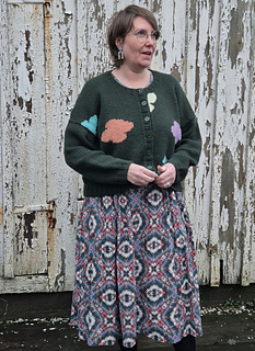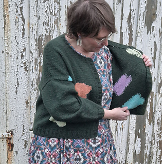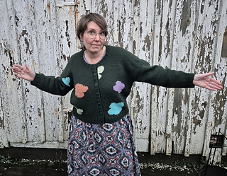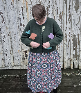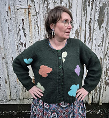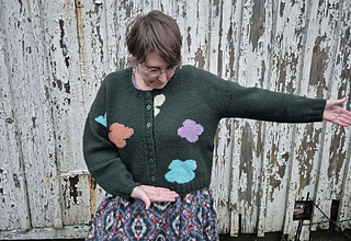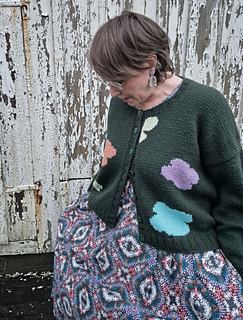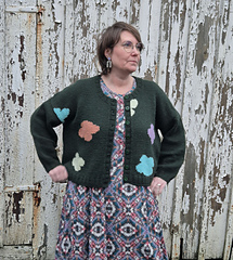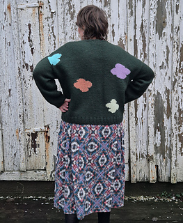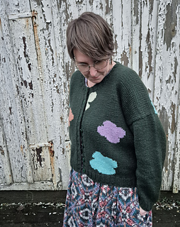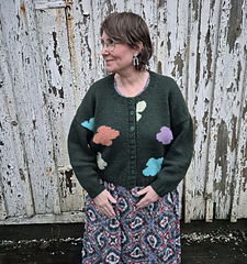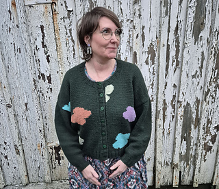 A fun intarsia cardigan with an irregular pattern of flower or clouds or what would you call them?