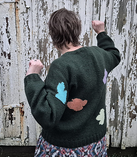 This cardigan is worked top down starting with Judy´s magic cast on to get stitches in both direction for fronts and back. The whole body is worked flat with intarsia. Work back down to armhole and then work fronts separate down to armhole. Join fronts and back to work together down to hem. Work hem in ribbing. Stitches for sleeve are picked up around armhole then sleeves are worked in the round with decreases down to cuff. Work cuff in the same ribbing as for body. Pick up stitches for neckline and work ribbing then finish the piece by knitting button bands.