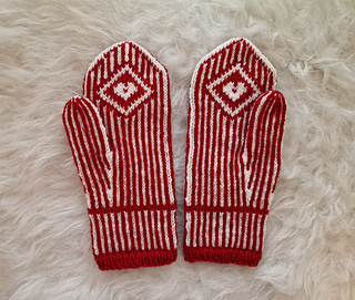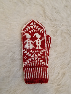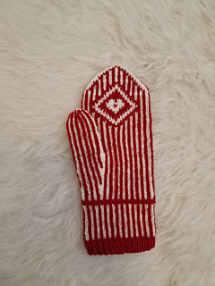 Mudden är stickad med 3,00 mm och själva vanten är stickad på 3,50 mm.