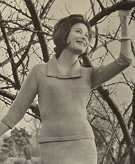 The top is slick and fitting—note the eye-catching collar edged with matching ribbon and knitted in the same pattern as the skirt, and the easy fit of the raglan threequarter-length sleeves. A closely woven honeycomb stitch is used for the skirt, which is knitted straight and shaped while making up.