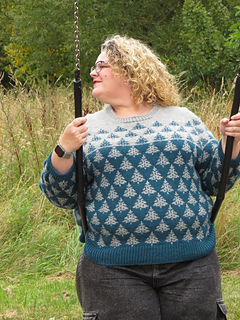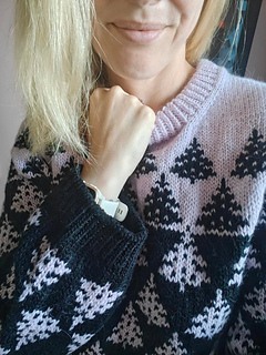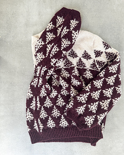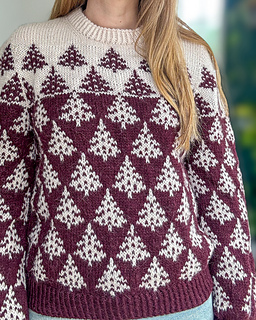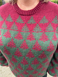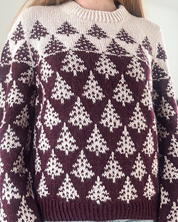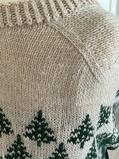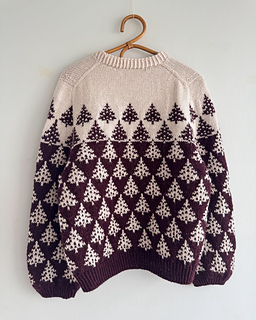 Sweateren kan nemt pyntes. Broder fx små julekugler på et eller flere af træerne, eller hav en tynd paillet følgetråd med når du strikker fx træer eller ribkanter.