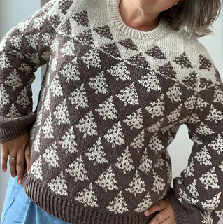 Sweateren strikkes oppefra og ned med english tailored shoulders. Sweateren er monteringsfri og strikkes i et stykke.