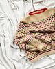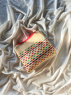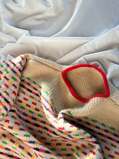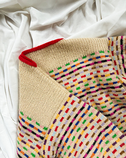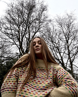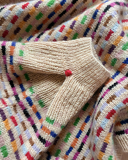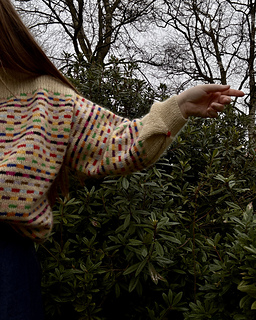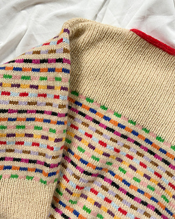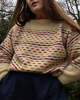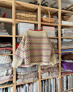 Method: This sweater is worked bottom up in multicoloured Stockinette Stitch - first in the round while the body is worked, and then back and forth whilst the front and back pieces are formed. Throughout the whole work, the multicoloured stripe pattern is worked according to a chart - when knitting the stripes, it is important to follow the instructions for colour dominance in order to secure the right structure. Sections of rib are worked both on the front, back and sleeves, and the neckline is completed by a contrasting I-cord. To shape the sleeves, a box pleat is worked at the cuff, and lastly decorated with a little embroidery dot.