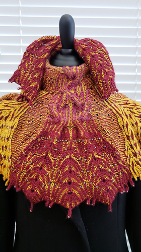 A brioche fingering yarn shawl with cabling, lace and beading to capture the beauty and mystery of the Northern Lights. Choose a variegated and a solid yarn to make this pattern. Wool blends work best, including alpaca or silk variegated yarns.