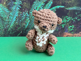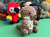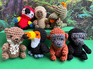 This not so giant version of the Giant River Otter is the 5th of 12 animals in the Little Amazon Mini Amigurumi Crochet Along. It joins the Mini Macaw from Day 1, the Little Capybara from Day 2, the Itty Bitty Iguana from Day 3, the Mini Monkey from Day 4, and the Tiny Toucan from Day 5. It sits about 4” tall, with a splotchy cream throat patch, and long tail.