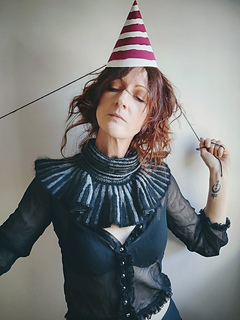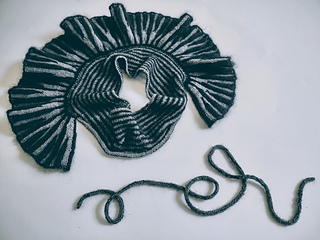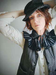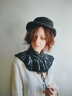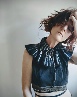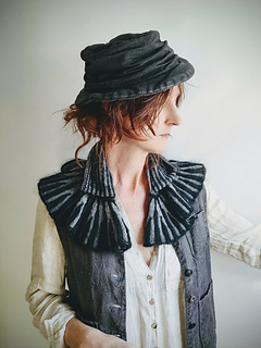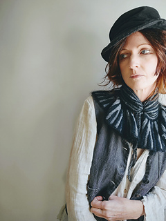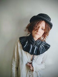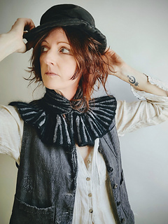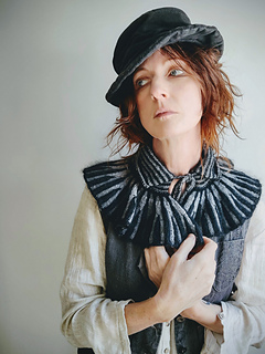 The Obsidian collar embraces form, function and flexibility. The collar has a close fitting neckline and gradually increasing body which creates a delicate cascade of rippled fabric. The collar functions to provide warmth and also as a decorative and somewhat theatrical accessory. Due to the configuration of the design, the collar can be styled in a variety of ways. The neckline portion of the collar is worked in thin horizontal stripes. The body of the collar has a vertical linear design that forks as the width of the fabric increases.
