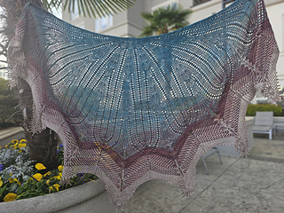 The name ‘octameric’ refers to the eight-fold symmetry of the shawl. The rippled edge of the shawl is reminiscent of sea creatures which is fitting since most creatures with an eight-fold symmetry live in the sea.