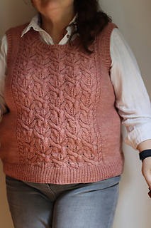 Oia is a sleeveless sweater with a modern, elegant look. Its round neckline and bold cable motif on the front add a touch of sophistication, while the overall shape remains light and airy. Perfect for seasonal transitions, it can be worn on its own with jeans for a casual look, or layered over a shirt for a more polished outfit. It provides just the right amount of warmth — ideal for cool days without feeling too heavy.
