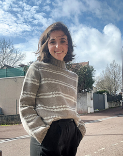 Oisans is a comfortable raglan sweater with a mock collar. This sweater is worked seamlessly from the top down and features stripes in a simple Fair Isle pattern. Construction begins with the collar. Short rows shape the rounded neckline. After knitting the yoke and separating the sleeves, the body is worked from the armholes in one piece. The sleeves are then picked up and knit in the round to the cuffs.