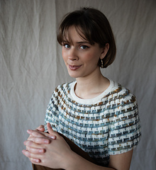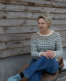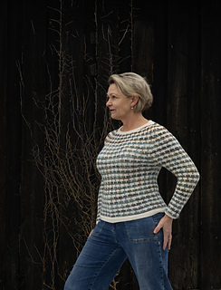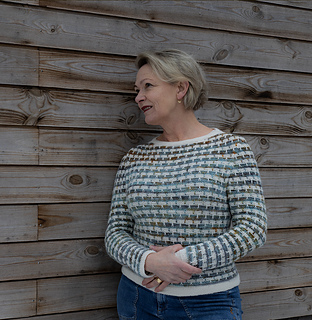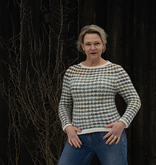 This blouse is worked top down designed with saddle shoulders in two yarn qualities.