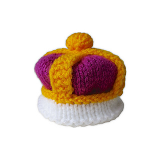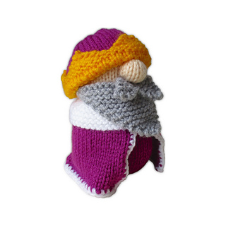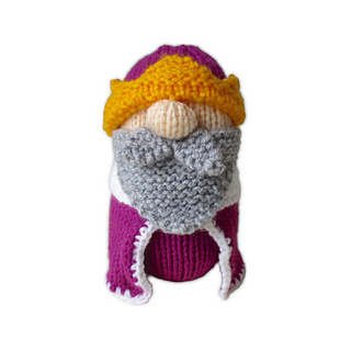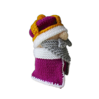 Old King Cole is a merry old soul and a merry old soul is he! King Cole has two crowns to wear: a coronet with yellow points, and an arched crown with a white brim. The king’s robe is finished with a single crochet border using a crochet hook, although you could add the trim using blanket stitch embroidery if you don’t crochet. Designed by Amanda Berry @fluffandfuzz, the king is knitted in acrylic DK yarns on single pointed needles (not in the round), and the robe’s border is a crochet edging.