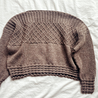 The Oldies is a relaxed fit sweater knitted bottom-up. In the beginning, the front and back are worked separately and joined at the sides. Continue knitting in the stockinette stitch in the round until separating the front and back again at the underarm to start working flat ‘Simple diamond stitch’ panel. After joining the front and back at the shoulders, the stitches for the sleeves are picked up and worked in the round. This sweater is cropped length, but adjusting the body length is simple. Recommended to be worn with 4-13¾″ / 10−35 cm positive ease.