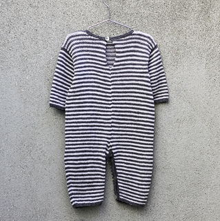 You start working each leg separately back and forth up to the crotch. Here, work is joined on one needle before the body is continued in the round. At the underarms, work is divided into front and back and each piece finished separately back and forth. The shoulder seams are grafted before stitches are picked up around the armhole, and the sleeves are worked in the round from the top down. The neckline, legs and sleeves are finished with ribbed edges. The suit is closed with buttons down the inside of both legs as well as with one button at the back-neck split.