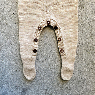 You start working the ribbed neckband and the upper part of the yoke back and forth before continuing with the rest of the yoke and body in the round down to the crotch. Here, work is divided and each leg and foot finished separately. The heel is an inserted type heel, also called ‘peasant heel’ or ‘forethought heel’ and it is very similar to an ‘afterthought heel’ – the heel stitches are knit onto a spare piece of yarn and then picked back up and the heel completed after the rest of the foot is finished. The sleeves are worked from the top down and finished with ribbed cuffs. Lastly, stitches are picked up for the button bands along the inner legs, and the button band is finished in ribbing.