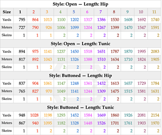 In addition to the unique construction, you have four styling options: open and hip length, open and tunic length, buttoned and hip length, and buttoned and tunic length. Yarn amounts are provided for all four variations.