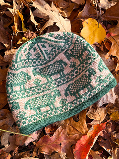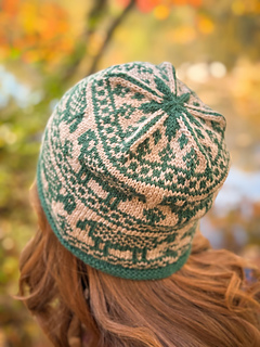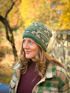 • 1 Hank of Each Color Kelbourne Woolens Scout (3.5oz/100g ea approx. 274yds/250m, 100% wool) in #307 Forest (MC, green, 100yds/90m total used), and #278 Oatmeal Heather (CC, tan, 80yds/73m total used)