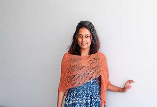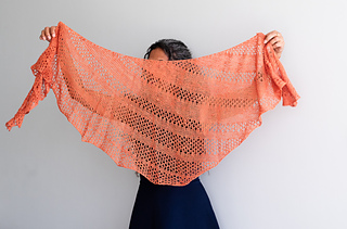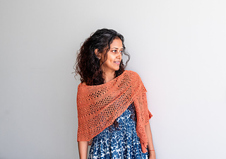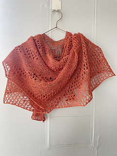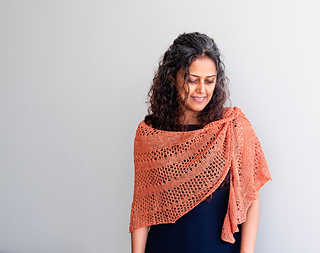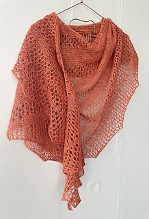 It is an asymmetric wrap worked in one piece. The design uses simple garter stitch bands interspersed with lace rows to create a breezy wrap.