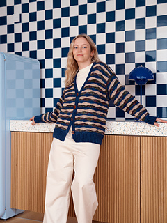 The body of this crochet cardigan is worked in one piece while the sleeves are crocheted separately. Both the body and sleeves are worked from the bottom up, beginning with ribbing. The design is finished with a ribbed button band.