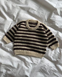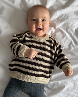 The brown and white Otto Sweater Baby is knitted in Sunday by Sandnes Garn in the colors Cacao nibs [3091] and Almond [2511].