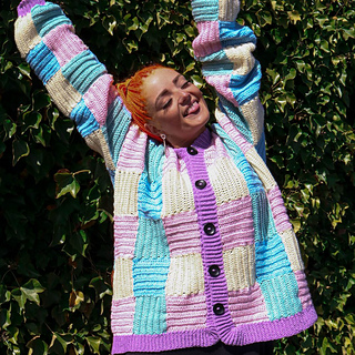 Patchwork Cardigan is a relaxed crochet cardigan built from simple squares with a clear, graphic layout. The alternating colours create a structured grid that gives the cardigan its distinct look, while the ribbed edges and button band frame the shape and add a clean finish. The overall silhouette is loose and slightly oversized, making it easy to layer and wear.
